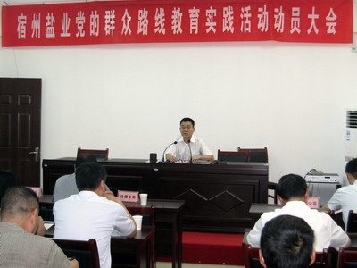 市公司经理张鹰主持会议并做动员讲话。他首先带领大家认真学习了开展党的群众路线教育实践活动有关文件,并结合宿州盐业实际,就当前工作中存在的问题,全面阐述了开展这次教育实践活动的重要性和必要性,要求大家认真把握活动总体要求,紧密联系工作实际,通过开展群众路线教育实践活动推进各项工作的开展。对下一步教育实践活动的开展,张鹰提出三点要求,一要密切联系实际,全力解决发展中存在的问题;二要密切联系实际,通过这次活动,推进中心工作开展;三要密切联系实际,建立健全宿州盐业发展的长效机制。他强调指出,全市盐业系统要通过开展党的群众路线教育实践活动,解决发展难题,促进企业发展,确保活动取得实效。