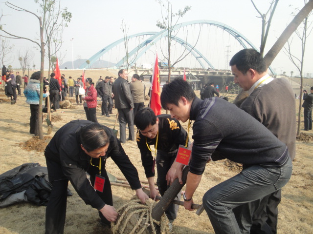 下午3点,党员同志们打出志愿者旗帜,佩戴志愿者胸牌,自备劳动工具,来到吉庆广场。他们有的挖坑、有的提水、有的抬树苗,在采石河岸挥汗如雨。这次活动是市直工委今年组织的第一次大规模集中活动,劳动现场热火朝天,很快一片志愿者林就初具规模。