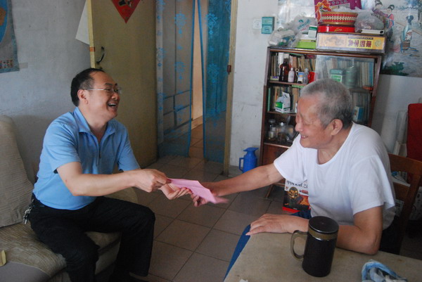 詹先豪一行来到离休干部高克家中,一进门就紧握住高老的手,关切地询问他的身体和生活等情况。看到高老精神状态很好,詹先豪非常高兴,介绍了上半年全系统开展的主要工作和取得的成绩,并强调这些成绩得益于多年来老同志们为盐业事业打下的坚实基础,凝聚着老干部、老党员们长期以来的心血和汗水。高老激动地说,今天天气这么热,你们工作这么忙,还抽出时间来看望我们,感到非常高兴。相信在省公司党委的坚强领导下,安徽盐业的明天会越来越好。随后,詹先豪向高老送上了慰问信和慰问金,聊起了家常,共话建党90年来国家取得的伟大成就。