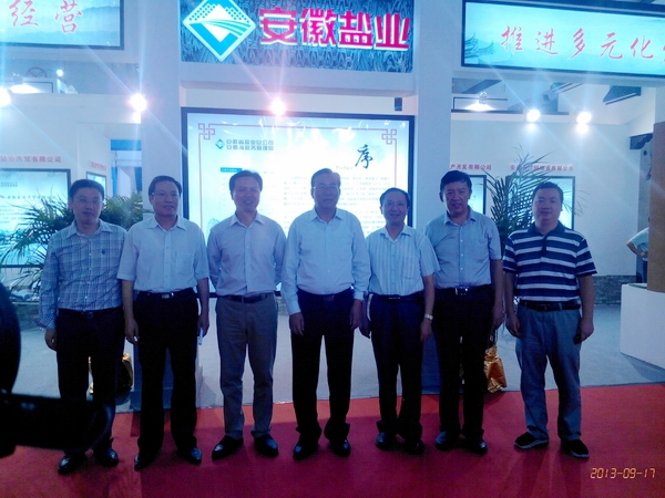 中国盐业总公司董事长茆庆国在安徽盐业展台和安徽盐业代表团成员合影留念