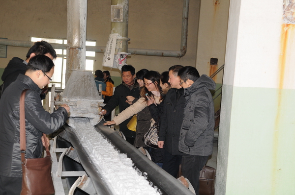定远盐矿副总经理陆金华等领导详细介绍了盐矿的基本情况、历史沿革、公司组织架构、生产经营状况以及制盐工艺流程,并带领大家参观了盐矿目前最先进的60万吨盐硝联产设备、热电厂、配送中心,实地体验了盐的一系列生产制作过程。