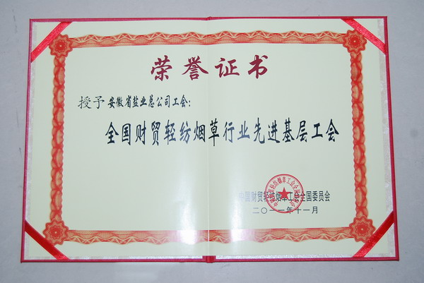 2011年,省盐业总公司工会在上级工会和省公司党委的正确领导下,高举中国特色社会主义伟大旗帜,以邓小平理论和“三个代表”重要思想为指导,深入贯彻落实科学发展观,紧紧围绕工会工作大局,紧密结合盐行业特点和实际,扎扎实实地做好本职工作,充分发挥桥梁纽带作用,较好地完成了各项任务。2011年11月,中国财贸轻纺烟草工会全国委员会授予安徽省盐业总公司工会“全国财贸轻纺烟草行业先进基层工会”荣誉称号。