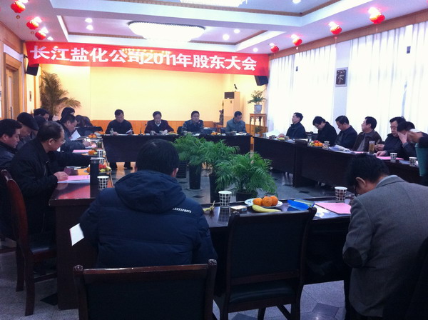 会议由长江盐化公司董事长楼观海主持。会议首先审议并通过了2011年度经营工作报告及2011年度财务决算报告和2012年度财务预算报告。总经理姚敦静通报了长江盐化2011年度经营工作情况,截止2011年12月底,长江盐化公司实现销售收入2亿元,完成目标任务200%,与去年同期相比增长691%;实现利润总额566万元,较上年增长155%。财务科负责人孙连平通报了2011年度财务决算报告和2012年度财务预算报告。会议还审议并通过了长江盐化董事会和监事会的改选预案及利润分配预案。长江盐化董事会改选后成员为:董道军、楼观海、姚敦静、姚杰、温树堂,监事会改选后成员为:刘兆虎、张有词、刘卫丽。