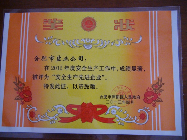 4月10日,在庐阳区政府举行的2013年全区安全生产工作会议上,合肥市公司被授予“2012年安全生产先进企业”荣誉称号。