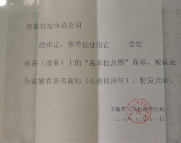 日前,省总公司持有并使用在食盐商品(服务)上的“迎客松及图”商标,再次被省工商行政管理局认定为安徽省著名商标,有效期自2015年1月至2018年12月底止。