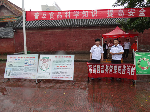 6月16日上午,蒙城县盐务局作为县食品安全委员会成员单位积极参加2015年食品安全宣传周启动仪式,开展以“尚德守法,全面提升食品安全法治化水平”为主题的食品安全宣传活动。 活动现场,蒙城县局设立咨询台,悬挂条幅, 摆放展板,发放宣传资料,向广大市民宣传盐业法律法规,涉盐犯罪案例,国家依法治盐,保障人民群众合格碘盐供应的政策,进一步深入宣传“食用低钠盐,生活更健康”的理念,提升了人民群众抵制假冒伪劣盐品的安全防范意识,营造了让群众放心,安心的食盐消费环境,形成了人人关心、参与、支持食盐安全的良好氛围。