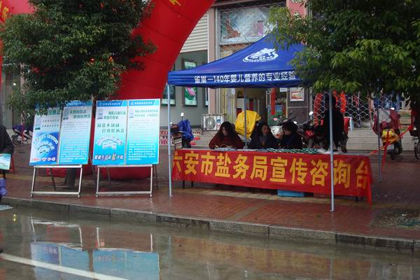 3月15日,在六安市繁华地段淠望路,2012年“3.15”消费者权益日主题活动在绵绵细雨中,拉开序幕。今年的主题是“消费与安全”。 六安市盐务局组织了盐政、运销、仓储等部门,积极参加了此次宣传活动,设立了展示台,开展了盐业法规和科学用盐知识的讲解,解答消费者的咨询,同时结合今年销售的重点,开展了海藻盐、低钠盐宣传活动,制作了宣传板和宣传资料,进行宣传销售,活动现场气氛热烈。 盐政管理重在宣传,六安市盐务局将以此次活动为契机,继续开展各种形式的宣传活动,把食盐安全深入民心。六安市政府有关领导参加了此次宣传活动,并参观了我局的展示台。