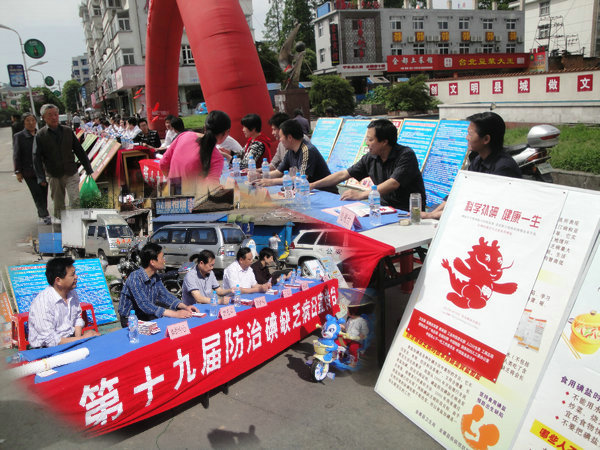 为切实做好第十九届“防治碘缺乏病宣传日”活动工作,金寨县盐务局成立了以局长周祥柱同志为组长的宣传领导组,制定了宣传计划,确定由盐政股具体负责实施。 今年宣传活动主题是“科学补碘,健康一生”。今年的活动受到县政府高度重视,县地方病防治领导组5月10日就牵头召开了成员单位专题会议,安排宣传活动,该县分管副县长蔡黎丽亲自主持会议并作重要讲话,县地方病防治工作成员单位就如何搞好今年的“防治碘缺乏病日”活动作了表态发言。 5月15日上午,金寨县盐务局会同县卫生局、疾控中心、教育局、广电局、财政局等县地方病防治领导组成员单位的领导和工作人员早早就来到喷泉晨光广场,该县分管副县长、两位人大副主任亲临现场指导,隆重拉开了第十九届“防治碘缺乏病日”宣传活动序幕。喷泉晨光广场上矗立着巨大的彩虹门,上面书写着一排醒目的宣传标语,彩虹门下的宣传台前,高音喇叭开始播放碘缺乏病知识、碘盐知识及盐业法规。 本届活动,参加宣传人数21人,为开展宣传以来历史之最。在新城关设内容以“科学补碘,健康一生”为宣传主题的彩虹门一座,新老城关共拉挂横幅六条,设置展板10块;在新老城关共设立主咨询台两处,在燕—古片(燕子河、古碑)、斑—南片(斑竹园、南溪)等较大乡镇出动流动宣传车两辆,发放宣传单3种(省地病办制作的彩色折叠式宣传单、省公司制作的彩色以宣传天然海藻盐和低钠盐为主题的宣传单、我局自制的以“科学补碘,健康一生”为主题的黑白宣传单)2000余份;由疾控中心检验队员,盐务局盐政人员、乡镇卫生员参加,到居民家检测碘盐36份,合格率100%;接受宣传咨询人数估计达2000余人;电视台还专门制作了专题片,盐务局、疾控中心以共同名义在金寨电视台打印滚动字幕一条。