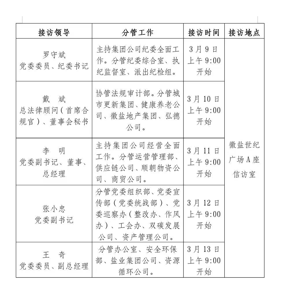根据工作安排,现就省生态环境集团领导班子成员3月份接待群众来访安排公示如下:
