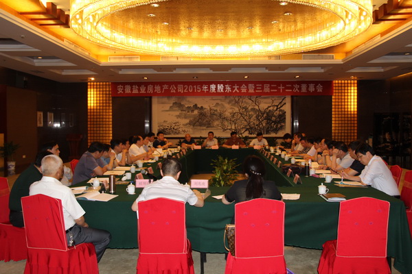 5月25日下午,徽盐地产2015年度股东大会暨第三届董事会第二十二次会议在合肥梅山饭店隆重召开。徽盐地产全部19家股东代表、全体董事、监事及公司经营班子全体成员出席会议。省公司总经理、徽盐地产董事长詹先豪主持大会,省公司副总经理、徽盐地产董事杨晓彬代表领导班子作工作报告。