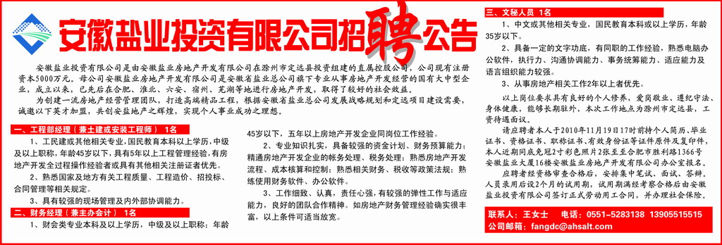 为创建一流房地产经营管理团队,打造高端精品工程,根据安徽省盐业总公司发展战略规划和定远项目建设需要,诚邀以下英才加盟,共创安盐地产之辉煌,实现个人事业成功之理想。