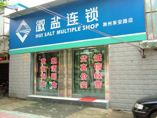经过2个月的精心筹备终于迎来了今天喜庆的日子。店面外徽盐连锁标识醒目、店面内商品琳琅满目。以徽盐连锁店规范标准,各类盐品、非盐统购商品以及烟酒日杂百货1000多种摆放整齐,货源充沛。滁州徽盐直营店的开业标志着滁州盐业公司迈开了徽盐连锁式经营的第一步。